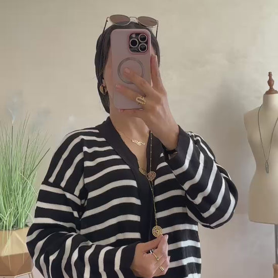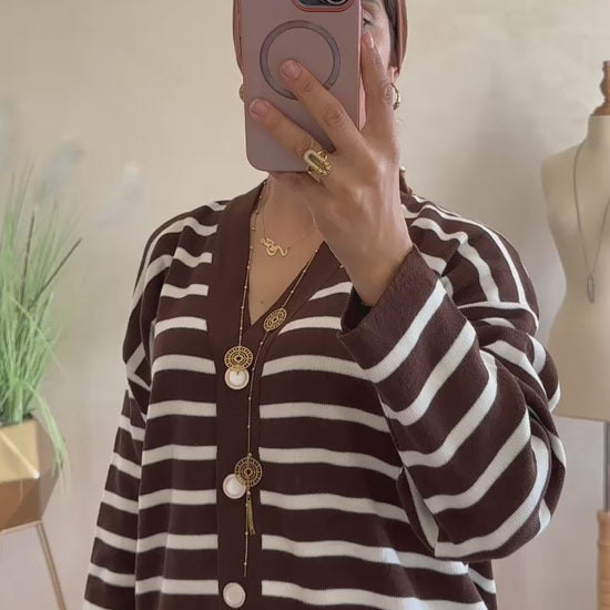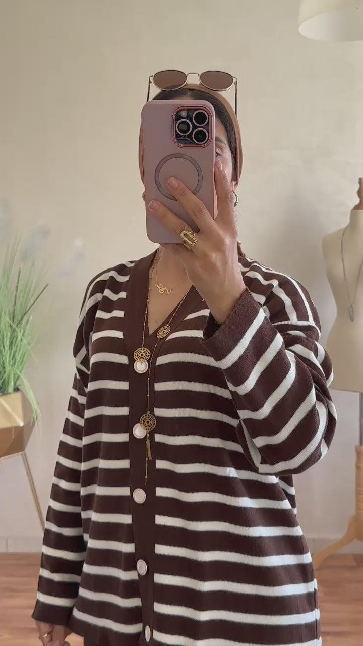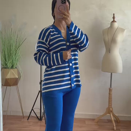 Optez pour l’élégance intemporelle avec notre ensemble en laine rayé orné de jolis boutons dorés. Une pièce raffinée qui allie confort et style pour vos journées et soirées